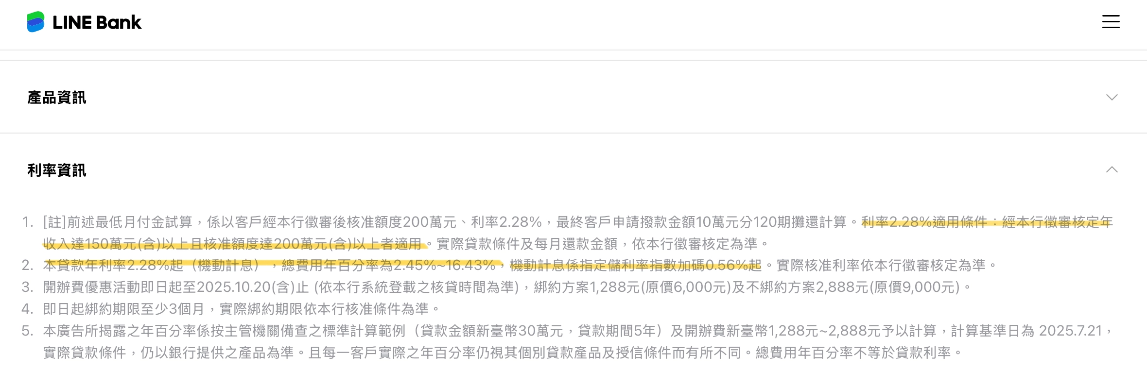 line bank 分期信貸的利率2.28%適用條件是:本行審核定年收入在150萬(含)以上,並且核准額度達200萬(含)以上的人才適用!