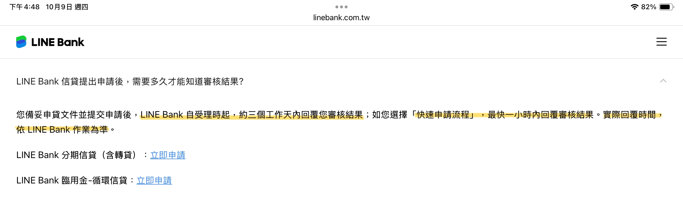 其實line bank官網寫的信貸審核時間都很迅速,約只要三天工作日就會回覆你的線上審核結果,而且選擇快速申請流程就可以在一小時內收到回覆,但一切都有但是!實際上回覆時間還是會按照line bank信貸審核流程為主!所以才會在Dcard上看到每個人收到的時間都不相同,有的還會一拖再拖,但有的人卻很快收到回覆。